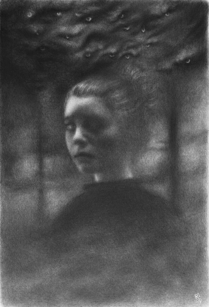 « ANGORIS II ». PanPastel et poudre de graphite.« ANGORIS IV ». PanPastel et poudre de graphite.« ANGORIS V ». PanPastel et poudre de graphite.« Orage. ». PanPastel et graphite.« Egarement ». Huile sur toile.« Lugubre ». Poudre de graphite et PanPastel.« Du bout des doigts ». Graphites.Sans titre. PanPastel et graphite.Portrait aux graphites.« Inspiration automnale ». Huile sur toile.« Intime désarroi ». Graphites.« Virée brumeuse ». Huile sur toile.